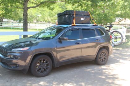So far, I’ve had to stop several times to secure my bike, the yoga mats on the roof, and readjust the roof bag and straps. The downside to the bag is the sail effect while diving in high winds…