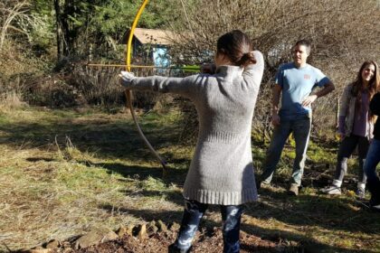The design of the archery range had double archer’s platforms made from two on-site pallets on top of salvaged cardboard covered with woodchips made from limb cuttings from the previous year. I measured the range to be 50 feet and bought some hay bales from a local farmer to use as a backstop. I also salvaged excess pumpkins from the community farm stand to use as targets. Call it coincidence, or synchronicity, but one of the newer residents also invited his friend that teaches bow making classes, so he came with his handmade bows and let us shoot them and also taught us tips and techniques! It was a great day and went better than I expected, especially with construction help from other residents. I was also given one of the handmade bows as a gift!!