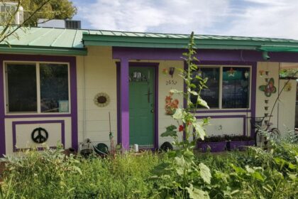 This is the front of Don’s PC homestead, which he painted white with purple trim accents – to help reduce heat absorption and attract pollinators with bright colors. He also replace with roof with metal so the rainwater collection wouldn’t be contaminated by chemicals in asphalt shingles.