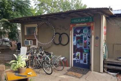 This is a view of the rental house turned underground cohousing community, which includes a couple of trailers for additional housing space. It’s tucked into an older neighborhood that is slowly being updated and gentrified with newer homes — a consistent trend in Austin.