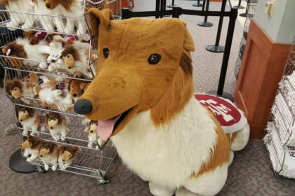 In the campus gift shop is a large stuffed version of Reveille near the checkout line for pictures!