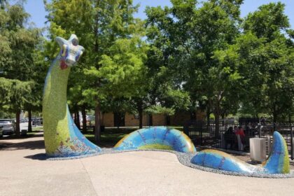 Right across the street from the Thinkery is a children’s playground park, that is accented by a 16-foot tall mosaic statue resembling the Loch Ness Monster!