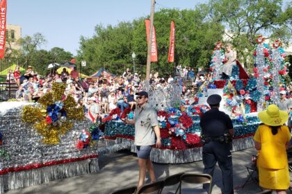 Part of the parade featured girls wearing long ornate dress tail trains sat on top of floats. This is a historical part of Fiesta. An interesting part of these young women’s attire are their shoes. They wear decorated cowboy boots they show off to the parade audience.