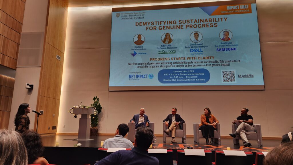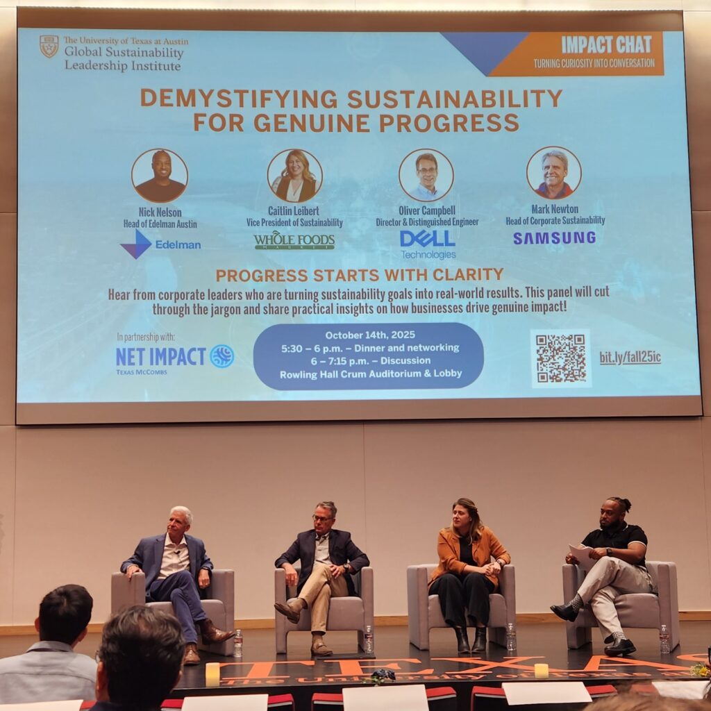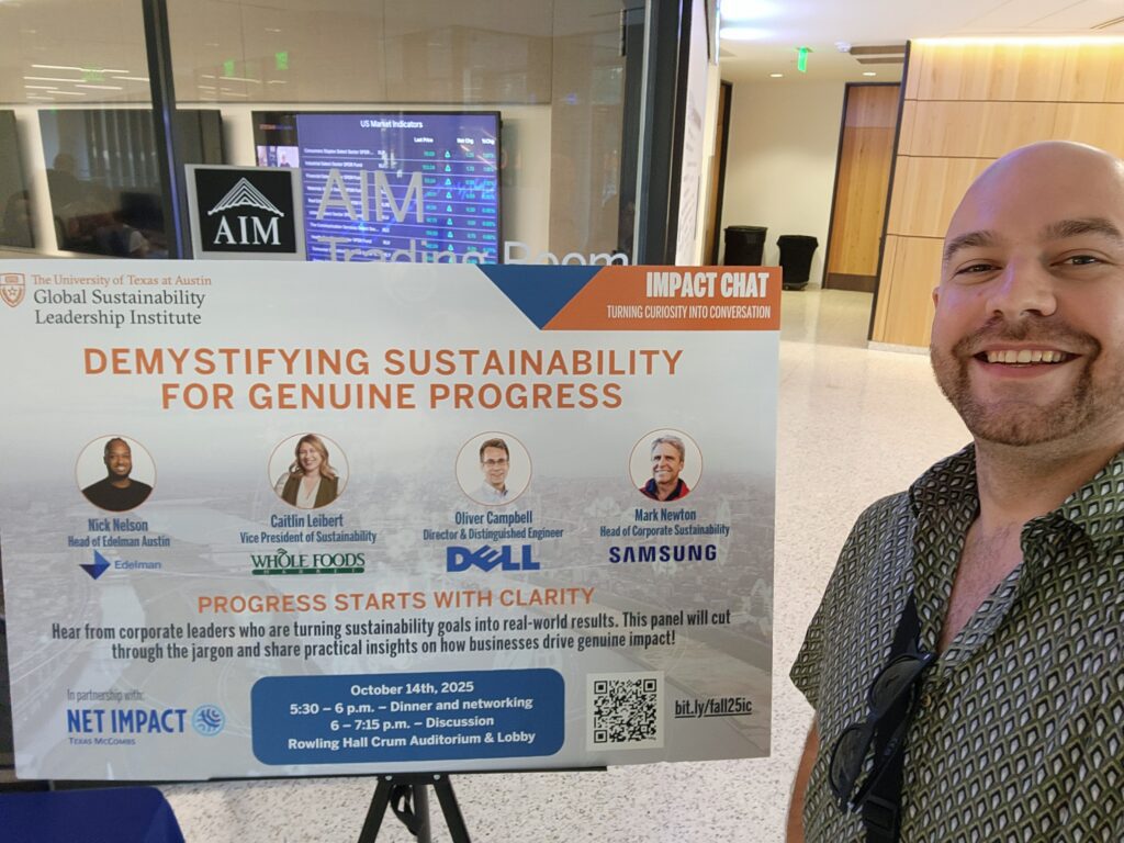 Tonight, I had the opportunity to attend “Demystifying Sustainability for Genuine Progress,” a panel hosted by the Global Sustainability Leadership Institute (GSLI) at UT Austin’s McCombs School of Business. The discussion brought together leading voices in corporate sustainability from Samsung, Whole Foods Market, and Dell Technologies, moderated by Nick Nelson, Vice President at Edelman Austin — who, fun coincidence, shares my last name.