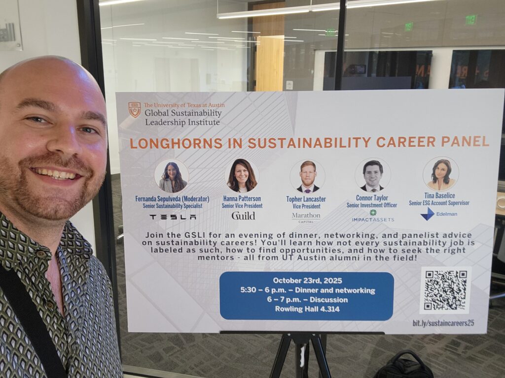 Kudos to UT Austin’s GSLI, Net Impact MBA chapter, and Edelman for bringing together such thoughtful voices. Events like this remind us that Austin’s sustainability community is not only growing but evolving — grounded in collaboration, authenticity, and genuine impact.