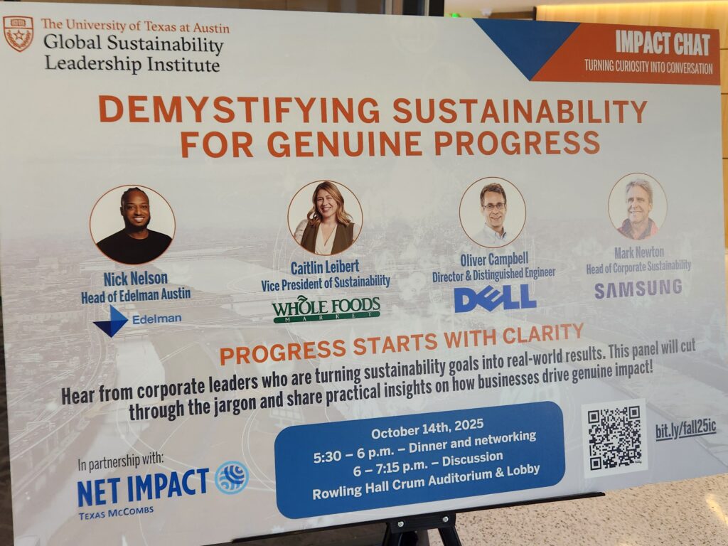 Tonight, I had the opportunity to attend “Demystifying Sustainability for Genuine Progress,” a panel hosted by the Global Sustainability Leadership Institute (GSLI) at UT Austin’s McCombs School of Business. The discussion brought together leading voices in corporate sustainability from Samsung, Whole Foods Market, and Dell Technologies, moderated by Nick Nelson, Vice President at Edelman Austin — who, fun coincidence, shares my last name.