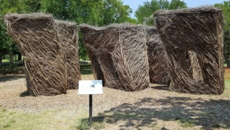 “Patrick Dougherty, a North Carolina-based artist, is known for creating whirling architectural sculptures from locally-harvested saplings. Dougherty and a team of over 200 Pease Park Conservancy volunteers constructed this site-specific installation using Baccharis neglecta (Roosevelt Weed) and Ligustrum, an invasive species, gathered in and around Austin. Yippee Ki Yay was privately funded by donations made to Pease Park Conservancy and was formally approved through the City of Austin’s Art In Public Places program.