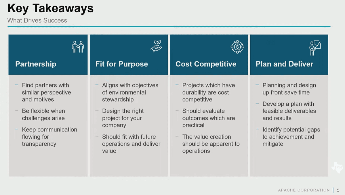 - Apache Corporation and the Borderlands Research Institute partnered to test revegetation methods on retired well pads, merging industry resources with scientific research.