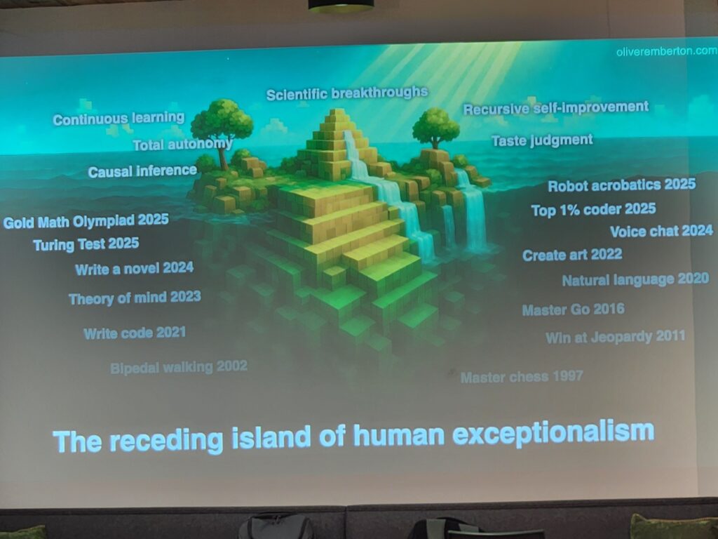 Emberton began with a vivid metaphor — the receding island of human exceptionalism. As technology, robotics, and AI advance, the areas once thought to be uniquely human keep shrinking. He referenced milestones like machines beating world champions at chess, writing novels, robots performing acrobatics, and even passing the Turing test. Today, AI can recognize speech, interpret images, and understand emotion with a fluency that once seemed impossible.