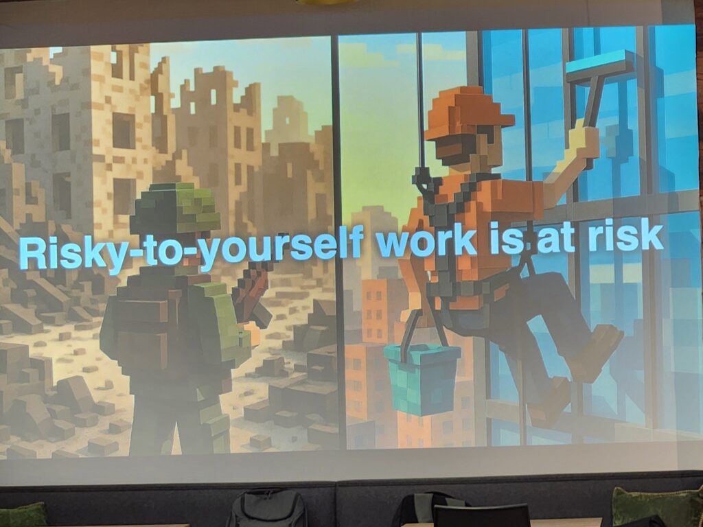 One of the most intriguing points of the evening was Emberton’s discussion of AI’s paradoxical role in job creation and elimination. As he explained, AI will increase the demand for jobs — but also reduce the need for them. Through the lens of a loosely interpreted universal basic income (UBI) model, he suggested that automation could free large parts of the population from traditional work, allowing people to opt in to creative, personal, or community-driven pursuits rather than labor out of necessity.