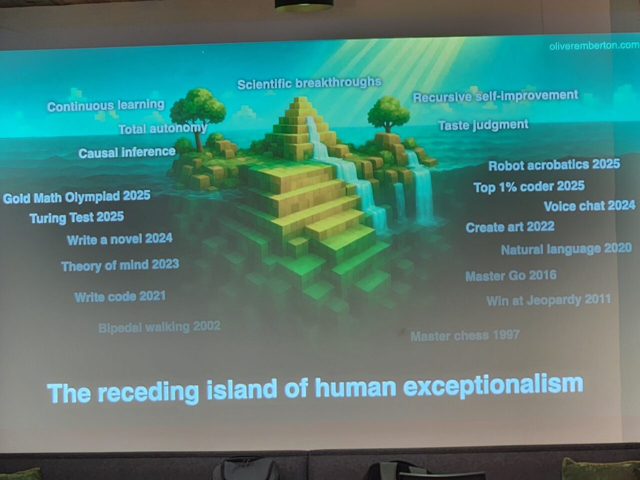 Emberton began with a vivid metaphor — the receding island of human exceptionalism. As technology, robotics, and AI advance, the areas once thought to be uniquely human keep shrinking. He referenced milestones like machines beating world champions at chess, writing novels, robots performing acrobatics, and even passing the Turing test. Today, AI can recognize speech, interpret images, and understand emotion with a fluency that once seemed impossible.